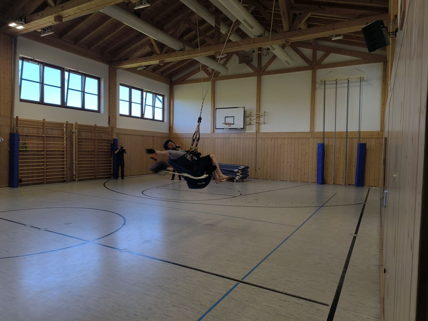Wir haben euch ein bisschen rumgewirbelt und ihr habt aus verschiedenen Positionen die Dummys in der Turnhalle rumgeschmissen.