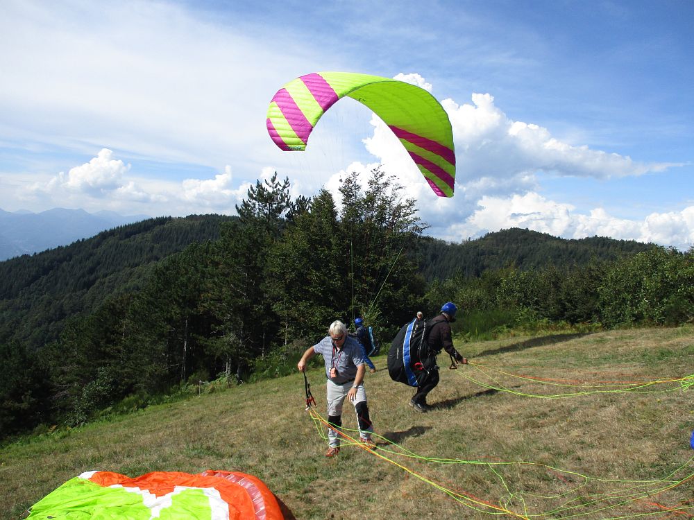 Diecimo war aus dem Wetterbericht und den vorgesagten Windverhältnissen für den Sonntag als Fluggebiet zu bevorzogen. Der Wind war allerdings am Anfang noch deutlich aus der falschen Richtung und zur Überbrückung der Wartezeit gab es noch einen Cappuccino. Birgits Gefühl für den Zeitpunkt zum Hochfahren passte genau. Das rettete uns einen schönen Flug.
