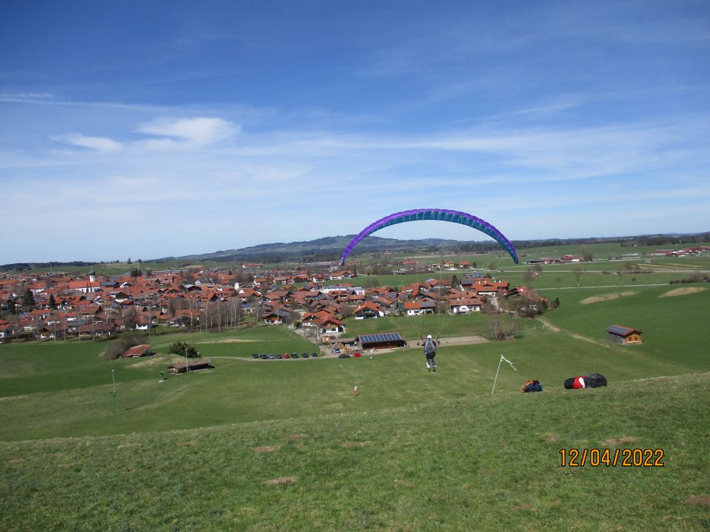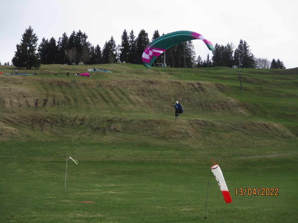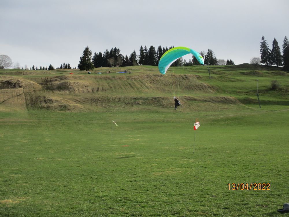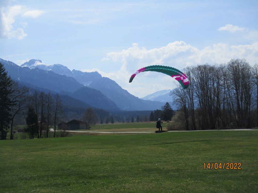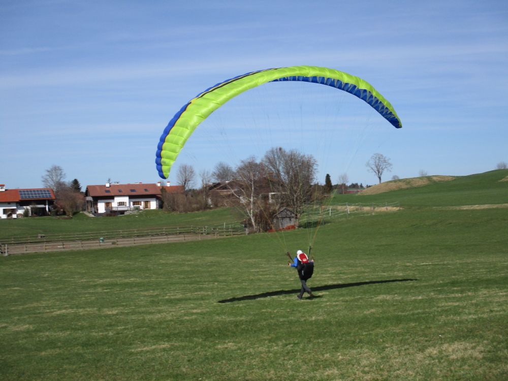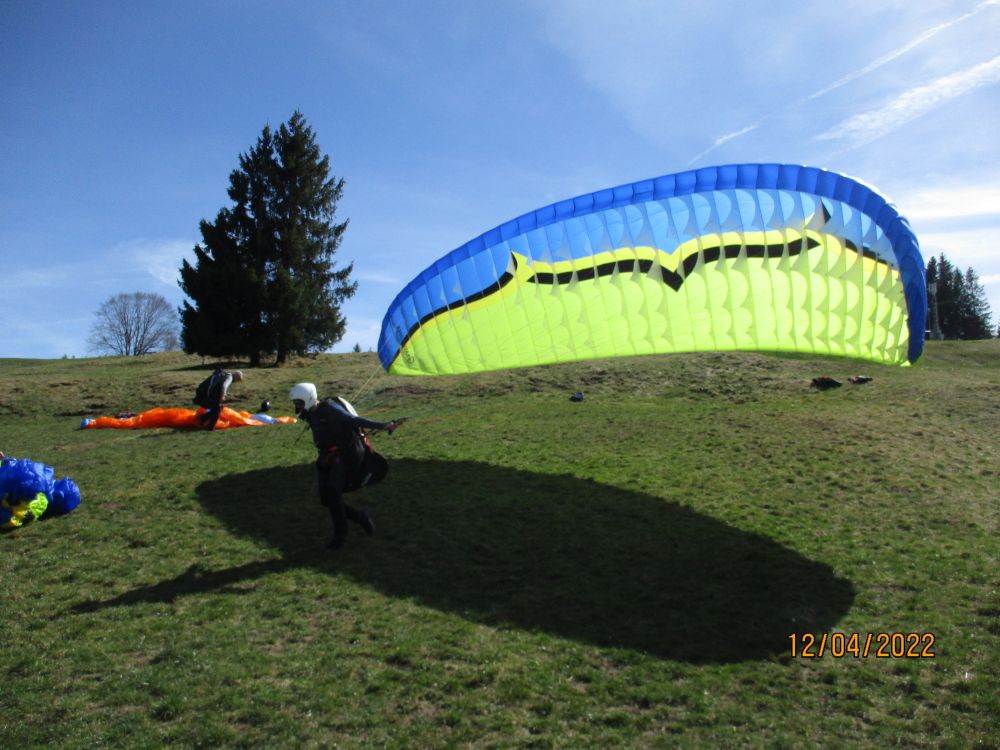 Während wir unten auf der Wiese die Grundtechniken wie Leinen sortieren, Kappe auslegen, Einhängen und Aufnehmen der Tragegurte übten, betreute Christian zwei Teilnehmer des Höhenflugkurses, die noch ihre Flüge der Grundausbildung beendeten.