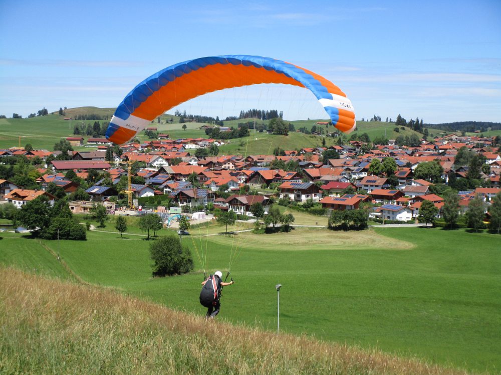 Da in dieser Woche noch Schulungsschirme übrig waren, konnten wir am Mittwoch statt der Single Skins normale Gleitschirme mit an den Hang nehmen. So lernten sie die Unterschiede zwischen normalen Gleitschirmen und den Single Skins kennen und dienten dem ein und anderen als Entscheidungshilfe für einen Erwerb einer Flugausrüstung.