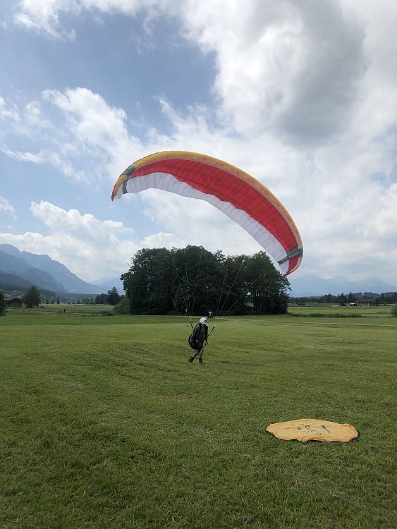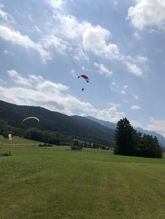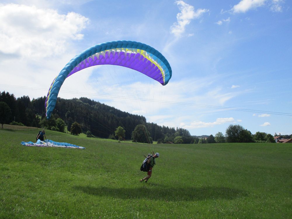 Da in dieser Woche noch Schulungsschirme übrig waren, konnten wir am Mittwoch statt der Single Skins normale Gleitschirme mit an den Hang nehmen. So lernten sie die Unterschiede zwischen normalen Gleitschirmen und den Single Skins kennen und dienten dem ein und anderen als Entscheidungshilfe für einen Erwerb einer Flugausrüstung.
