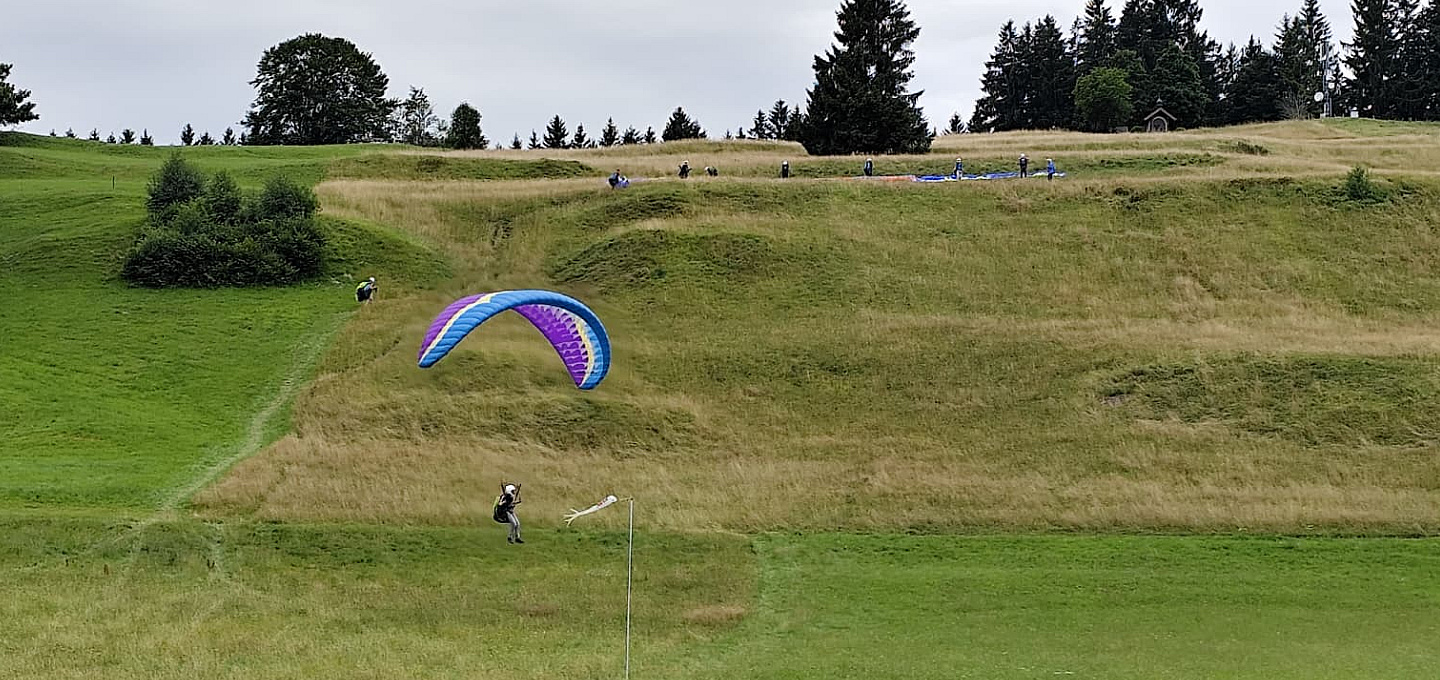 Am frühen Nachmittag des Dienstags bekamen wir eine Regenpause und nutzten sie bestmöglich aus. Ich hatte am Hang dazu die Unterstützung von Birgit und so kamen wir mit der großen Gruppe schnell voran. Hinzu kam, dass die sie das Gewünschte recht zügig und gut umsetzten. So kam es tatsächlich trotz anspruchsvoller Windrichtung noch zum ersten Alleinflug für alle vom Übungshang, bevor das Tief sich seiner Aufgabe erinnerte und wir die Praxis beendeten