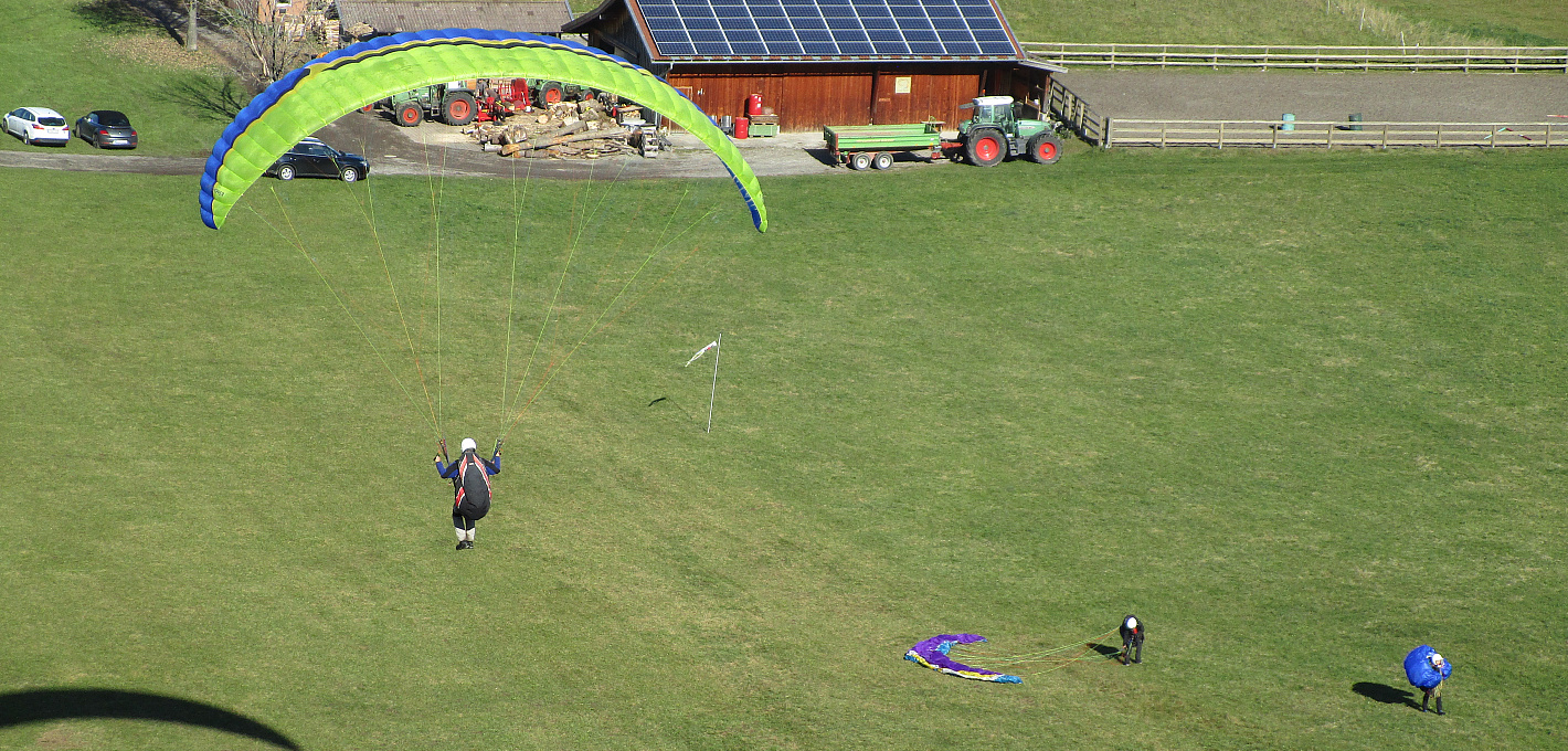 Mit Nullwind und einer durch den morgendlichen Nebel sehr nassen Wiese starteten wir die ersten Flüge. Es klappte gleich bestens. Kontinuierlich sammelten sie Flug für Flug. Einige testeten auch mal einen normalen Schirm und kamen auch damit gleich gut zurecht.