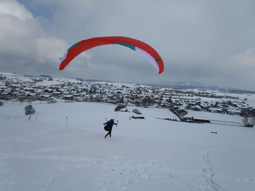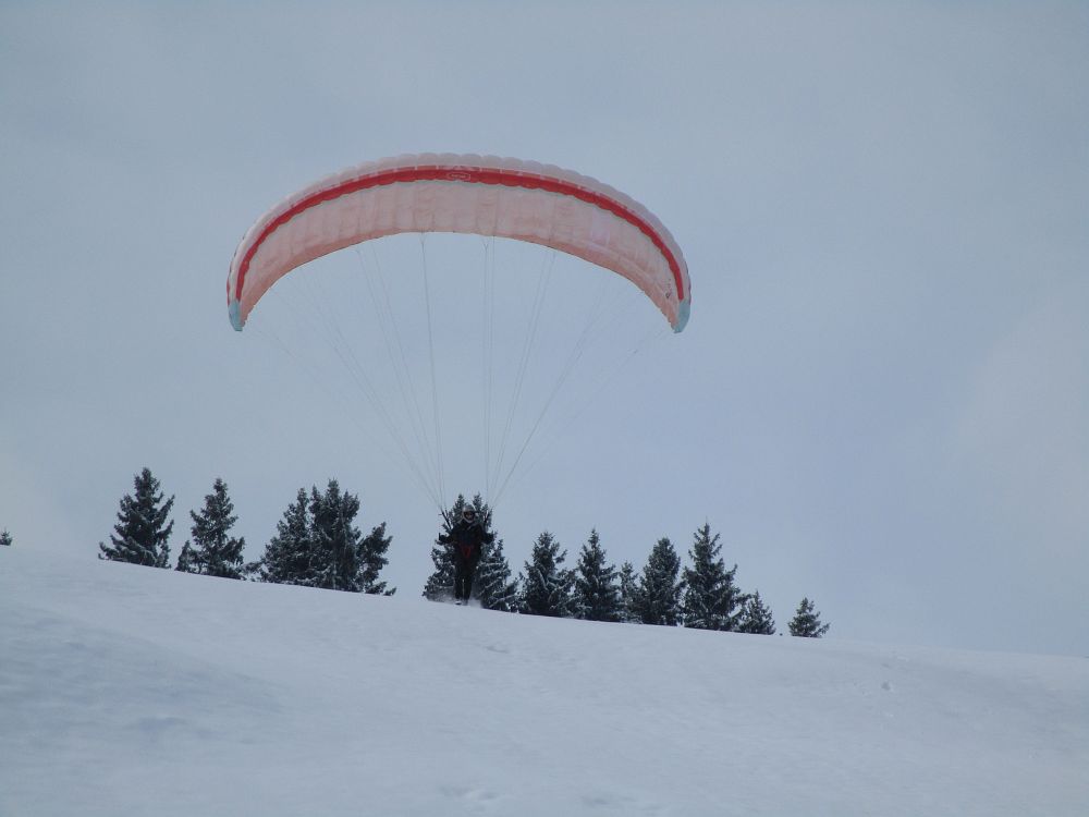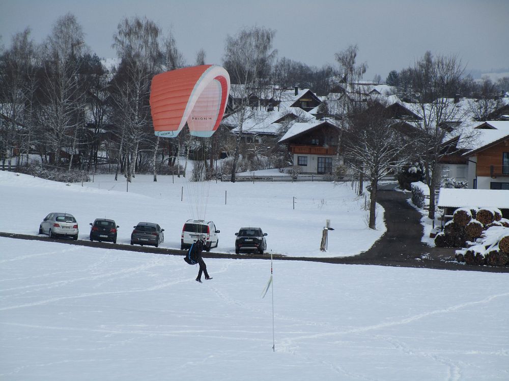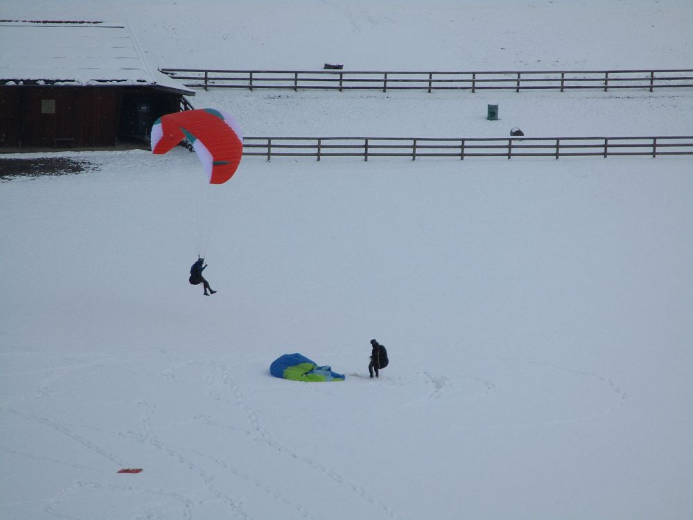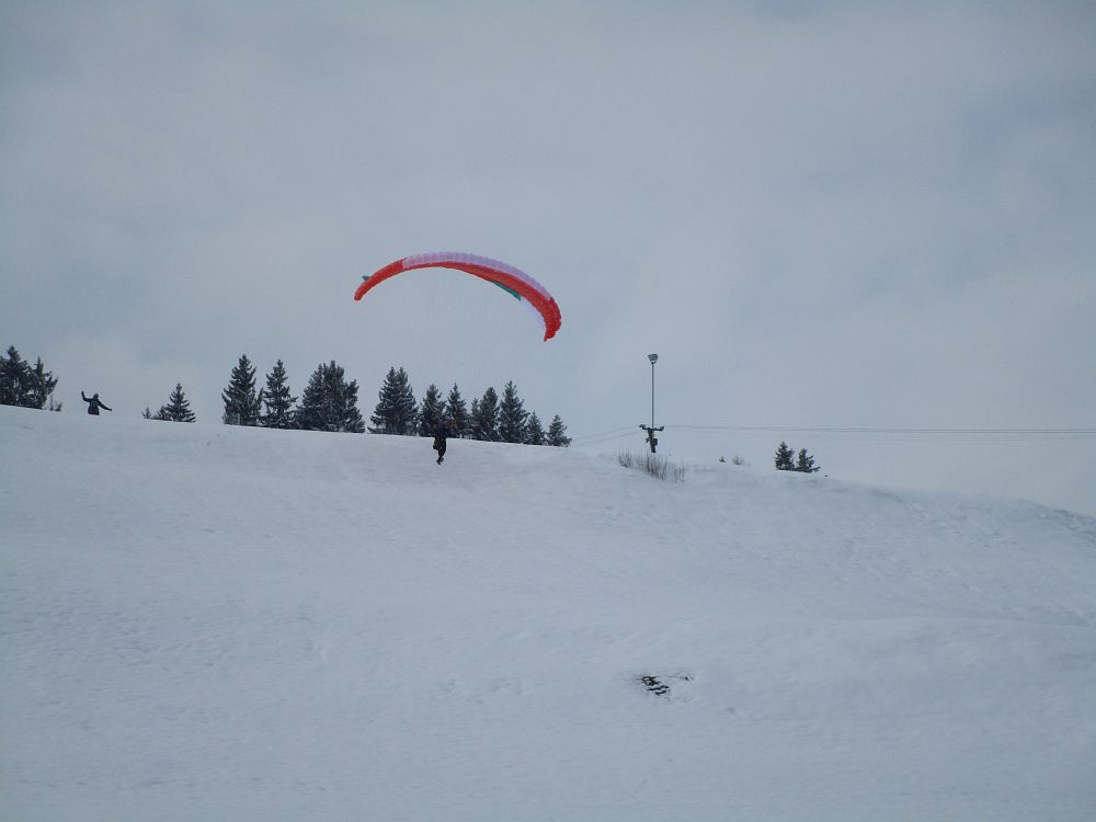 Die Einschulung am Sonntag erfolgte sehr zeitig, da schlechter Wind und weitere Schneefälle angesagt waren. Nach einige Aufziehübungen ging es gleich rauf, bevor die Schirme zu nass geworden wären. Im Großen und Ganzen klappte es recht gut.