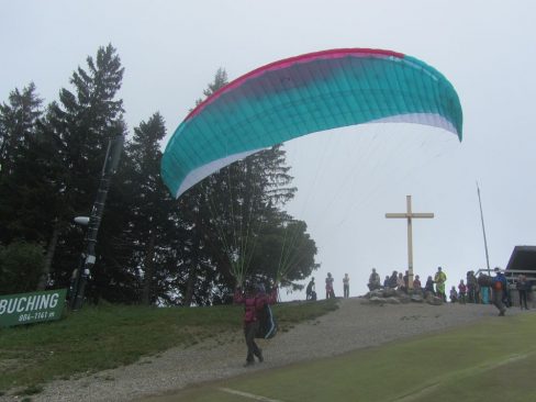 Der Freitag sah anfangs auch nicht viel besser aus, aber der Nebel hob sich am Vormittag dann doch noch über den Startplatz des Buchenberges hinaus. Vier bis fünf Flüge konnten immerhin pro Pilot erzielt werden. Erst der allmählich stärker werdende und dann zu starke Ostwind ließ uns keine andere Option als gegen 15 Uhr das Fliegen abzubrechen.