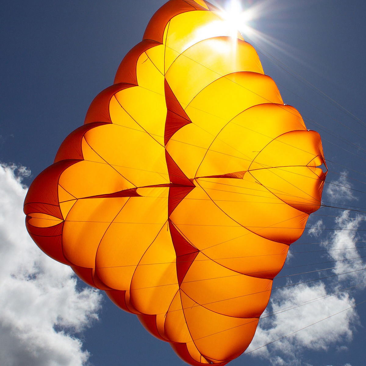 „optimierter Bauform der Kreuzkappen. Hervorragende Sinkraten, jeweils nur knapp über 5 m/s, entspricht einem Sprung aus etwa 1,3 m Höhe“